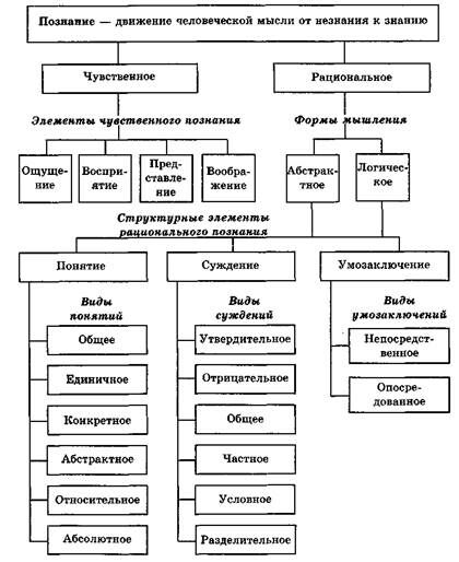 Различают два вида познания: чувственное (обыденное) и научное (рациональное). Чувственное познание является следствием непосредственной связи человека с окружающей средой. Познание мира человеком и взаимодействие с ним осуществляется благодаря функционированию органов зрения, слуха, осязания, вкуса. Чувственное познание выступает в 3 формах, являющихся ступенями познания: ощущение, восприятие, представление (воображение).