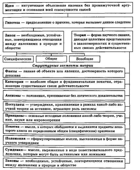 Более высокая степень научного знания находит свое выражение, как отмечалось, в локально-логических формах. При этом процесс познания идет от научной идеи к гипотезе, превращаясь впоследствии в закон или теорию. Основные элементы теоретического уровня познания представлены на рис. 1.3.