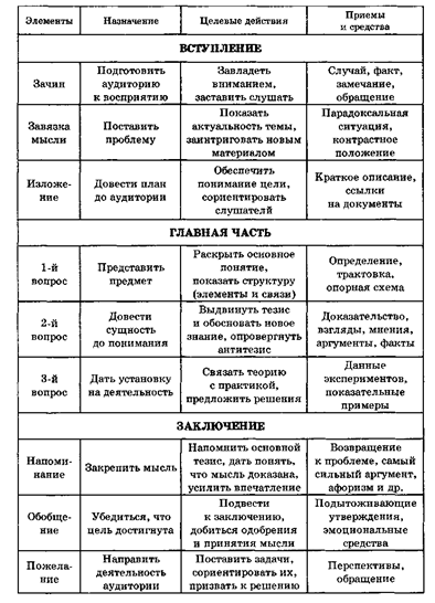 Выступление должно строиться по плану (следует разработать план выступления), который предусматривает перечень основных элементов речи согласно традиционной композиции. Композиция – это расположение материала в разрезе 3 блоков: