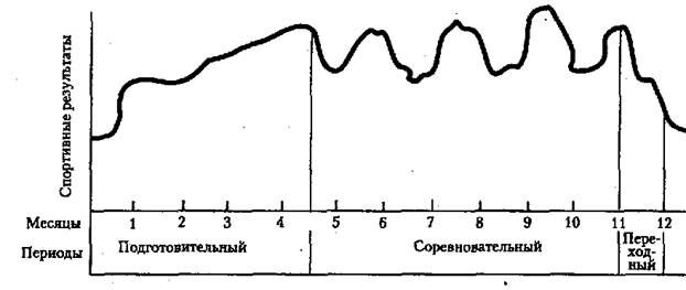 Трехпиковая кривая развития спортивной формы и соответствующие им семь периодов тренировки