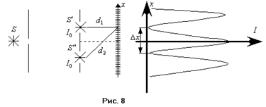 Основное противоречие здесь заключается в следующем: явление фотоэффекта и эффекта Комптона, казалось бы, довольно убедительно показали, что свет есть ничто иное, как поток корпускул. Тогда, так как интенсивность зависит от числа фотонов, то если освещать непрозрачный экран двумя лучами, по идее, интенсивность для каждой точки экрана должна быть выше, чем если бы его освещали только из одного источника. На деле же для некоторых участков экрана интенсивность, в соответствии с рис. 8, получается более низкой, а для других – более высокой, чем должна бы в соответствии с квантовой моделью. С точки зрения корпускулярной теории это явление объяснить нельзя. Однако, если ввести в рассмотрение волновую модель света, описанное явление получает замечательное объяснение с помощью явления интерференции. Таким образом, для света характерны корпускулярные и волновые свойства.