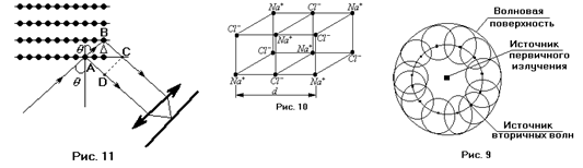 называют периодом кристаллической решётки. Существуют более сложные кристаллические решётки, например, кубическая гранецентрическая кристаллическая решётка, объёмоцентрическая решётка и т. д. Как уже говорилось ранее, существует возможность использовать кристаллическую решётку в качестве дифракционной. Однако это будет трёхмерная дифракционная решётка. Рассмотрим процессы, происходящие при прохождении луча сквозь кристалл. Если волна падает на кристалл в определённом направлении, то мы можем рассматривать процесс прохождение волны через кристалл как последовательные отражения её от кристаллических плоскостей. В этом случае ион становится источником вторичных волн. При этом часть луча отражается от ионов первой кристаллической плоскости, а другая часть проходит дальше. Так как угол падения равен углу отражения, то те фотоны, угол падения которых был одинаков, после отражения будут двигаться параллельно друг другу. Чтобы собрать их вместе, поставим на пути отражённого луча собирающую линзу. Тогда на экране, расположенном за линзой мы сможем наблюдать дифракционную картину. Как известно, интерференционный максимум или минимум определяются тем, приходят ли волны в данную точку синфазно или же в противофазе. Разность фаз двух лучей будет зависеть от расстояния, пройденного этими лучами.