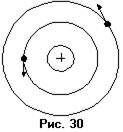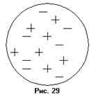 По модели Томпсона (рис. 35) атом представлял собой непрерывно распределённый в пространстве положительный заряд, в который были вкраплены отдельные отрицательные заряды. Электроны взаимодействуют с элементами положительно заряженной среды атома по закону Кулона. При отклонении электрона от положения равновесия, возникают силы, которые стремятся возвратить его в положение равновесия. Благодаря этому возникают колебания электрона. Колебания электронов обуславливают излучение атомов.