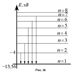 . В опытах Франка – Герца, как мы помним, фигурировало именно это число. Основываясь на представлении Бора о процессе излучения атома, можно сделать вывод, что спектральные серии соответствуют переходу атома с одних энергетических уровней на какой-то другой. Так, например, серии Лаймана соответствует переход атома водорода на первый энергетический уровень, серии Бальмера – на второй; серии Пашена – на третий. Этот факт позволяет найти длины волн в каждой серии. В соответствии со вторым постулатом Бора, мы можем записать, что при переходе с