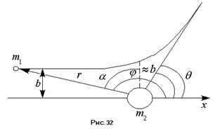 называется расстояние наименьшего сближения частиц, при отсутствии взаимодействия между ними (см. рис. 32). Получим это соотношение. Пусть на положительно заряженную частицу массой