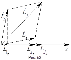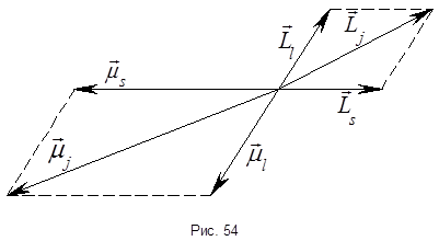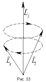 – 2 состояния, то существует 2 возможных угла между орбитальным и спиновым моментами. Так как направление момента относительно любой оси не определено, то возникает вопрос, что же понимать под углом между этими моментами? Смысл данного угла в том, что в отсутствии внешних сил полный момент импульса сохраняется, орбитальный и спиновой моменты прецессируют вокруг полного момента, а их проекции на направление полного момента имеют вполне определённые значения (рис. 53).