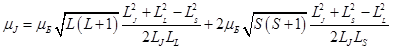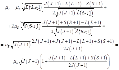 (3). Выражение (3) аналогично тому, которое связывает спиновой орбитальный момент с орбитальным механическим. Из этой аналогии следует смысл фактора Ланде – это гиромагнитное отношение для полного магнитного момента. В частности, получается, что если спиновое квантовое число равно нулю, то