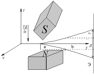 атомов пропускались через область в которой создавалось неоднородное магнитное поле. В нём двигались атомы. На экране Э наблюдалось расщепление пучка на две части. Первые опыты проводились с атомами серебра. Для одного внешнего электрона имеем: