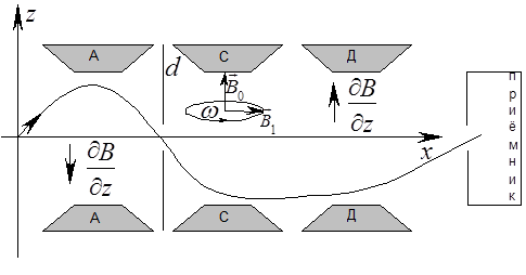 В данном методе пучок атомов проходит через систему магнитов, причём магнит А создаёт неоднородное магнитное поле, магнит С – однородное, а магнит Д – снова неоднородное. Между магнитами А и С устанавливали диафрагму