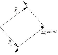 . Вместо вращающегося магнитного поля, можно пользоваться линейно осциллирующим магнитным полем. Его можно представить как суперпозицию двух полей, вращающихся в противоположных направлениях (см. рис. 62).