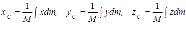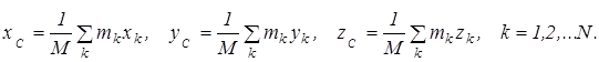 , из (2.1) проецированием на декартовы оси координат получим следующие формулы для координат центра масс: