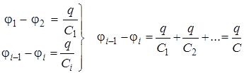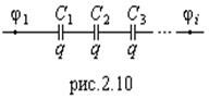 При последовательном соединении (рис.2.10) заряды на конденсаторах одинаковы, а разность потенциалов на каждом запишется:
