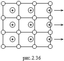 сместить из центра вертикально вверх. Суммарный дипольный момент в этом случае направлен вдоль вертикальной оси. Необходимое условие появления не равного нулю суммарного дипольного момента - отсутствие центра симметрии (рис.2.35). Здесь на рис.а центральный ион находится в центре симметрии квадратной элементарной ячейки, на рис.б этот ион смещен из центра вдоль диагонали квадрата, т.е. для данного случая центр симметрии в элементарной ячейке отсутствует. Такое смещение в одной элементарной ячейке приводит к подобным смещениям во всех соседних ячейках. Схема, иллюстрирующая деформации в сегнетоэлектрике (показано смещение лишь положительных ионов), приведена на рис.2.36. В результате образуется спонтанный суммарный дипольный момент