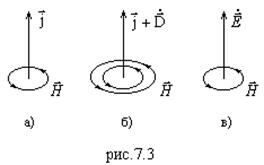 Физическое содержание уравнения (7.5) иллюстрирует рис.7.3. Рис.7.3, а – случай когда имеется лишь ток проводимости, который определяет магнитное поле. Рис.7.3, б изображает общий случай, когда ток проводимости и ток смещения вместе создают магнитное поле. Рис.7.3, в -случай, когда не существует тока проводимости (вакуум), а магнитное поле создается изменением электрического поля.
