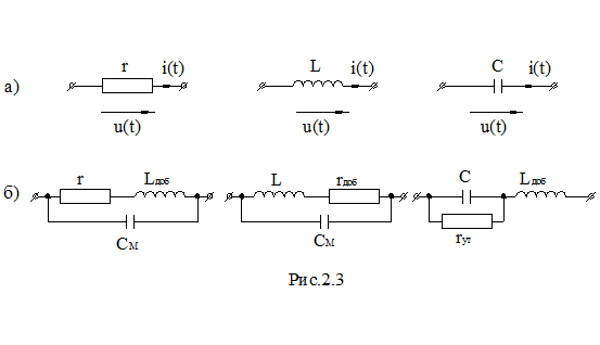 для конденсаторов, рис. 2.3б. В проволочных сопротивлениях и катушках индуктивности учитывают также межвитковую емкость