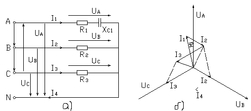 При соединении фаз потребителя звездой, один из проводов каждой фазы подключается к точкам А, В, С соответственно, а остальные три провода объединяются и присоединяются к точке N. Схема соединения приведена на рис.3.5.1а. При таком соединении к каждой из фаз потребителя приложено фазное напряжение сети.