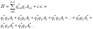 Заметим однако, что гамильтониан должен быть эрмитовым, поэтому должна оставаться операция комплексного сопряжения всех операторов. Предположим, что для данного состояния, мы получили позицию курсора в “положении 2”, следовательно, мы имеем матрицу А2А1, подействовавшую на регистр. Теперь q2 , который передвинет занятое положение на следующую позицию, не обязательно возникает из первой строчки - он может прийти из второй, т.е. из члена