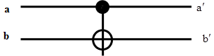 бит b (мишень = target) меняет свое состояние тогда и только тогда, когда состояние контрольного (control) бита a соответствует 1; при этом, состояние контрольного бита не меняется.
