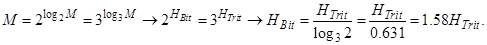 Рассуждая аналогично, можно получить соотношение между энтропиями, выраженными в тритах и битах: