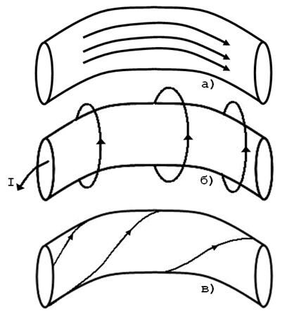 (б), в результате чего силовые линии суммарного магнитного поля располагаются послойно и спирально обвивают плазменный шнур (в).