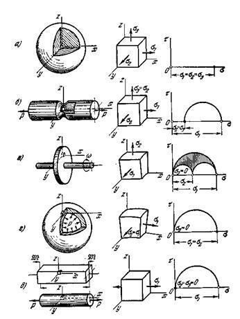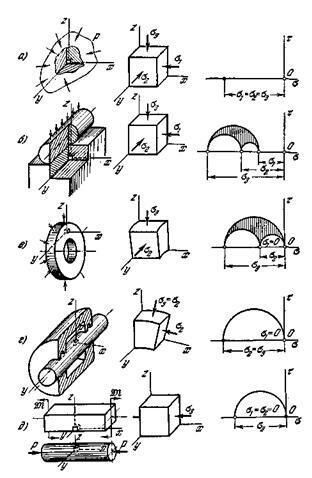 Чистое трехосное сжатие возникает в любом теле, независимо от его формы, при всестороннем гидростатическом давлении (рис. 1.20, а). Неравномерное трехосное сжатие характерно для точек, расположенных в окрестности контактирующих тел, таких, как, например, ролики и обоймы подшипников, втулки и валы, и др. (рис. 1.20 б). Пример возникновения двухосного сжатия показан на рисунке 1.20. в. Двухосное равное сжатие (