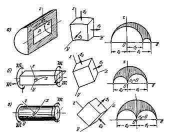8. Приведите пример элемента конструкции, испытывающей смешанное трехосное напряженное состояние. Как выглядят круги Мора?