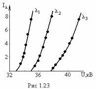 уменьшая напряжение U, получают зависимость интенсивности Iλ от напряжения U. Эта зависимость для трех длин волн показана на рис. 9.