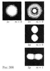 На рис. 306 для примера приведено 1 распределение электронной плотности I (формы электронного облака) для состо- | яний атома водорода при п = 1 и п = 2, 1 определяемое |tpnfrnJ2. Как видно из ри- у сунка, оно зависит от п, 1я т;. Так, при I I = 0 электронная плотность отлична от 1нуля в центре и не зависит от направ-; ления (сферически-симметрична), а ; для остальных состояний в центре рав- на нулю и зависит от направления. [ 3. Спектр. Квантовые числа I, n и щ i позволяют более полно описать спектр | испускания (поглощения) атома водо-I рода, полученный в теории Бора (см. I рис. 297).