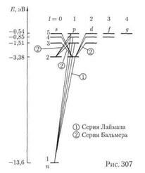 Учитывая число возможных состояний, соответствующих данному п, и правило отбора (223.9), рассмотрим спектральные линии атома водорода (рис. 307). Серии Лаймана соответствуют переходы