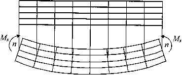 Сформулируем предпосылки теории чистого прямого изгиба призматического стержня. Для этого проанализируем деформации модели стержня из низкомодульного материала, на боковой поверхности которого нанесена сетка продольных и поперечных рисок (рис. 2). Поскольку поперечные риски при изгибе стержня парами сил, приложенными в торцевых сечениях, остаются прямыми и перпендикулярными к искривленным продольным рискам, это позволяет сделать вывод о выполнении гипотезы плоских сечений, которая, как показывает решение этой задачи методами теории упругости, перестает быть гипотезой, становясь точным фактом — законом плоских сечений. Замеряя изменение расстояний между продольными рисками, приходим к выводу о справедливости гипотезы о ненадавливании продольных волокон