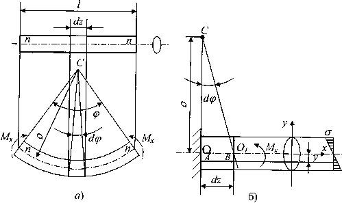 . Предварительно отметим, что постоянство поперечного сечения призматического стержня и изгибающего момента (Mх=сonst), обеспечивает постоянство радиуса кривизны нейтрального слоя по длине стержня (рис. 3, а), нейтральный слой (п—п) описывается дугой окружности.