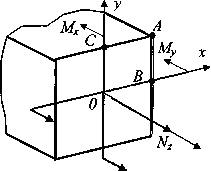 Обратим внимание на особенности расчета при сочетании изгиба, растяжения и кручения стержня прямоугольного поперечного сечения (рис. 4.) Для выявления опасной точки здесь должны быть сравнены напряжения косого изгиба с растяжением в точке А, с эквивалентными напряжениями в точках В и С.