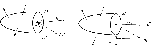 , а проекция на плоскость, проходящую через точку М и ортогональную вектору n, — касательным напряжением