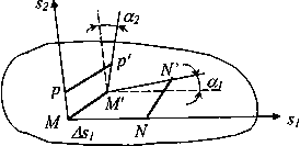 Для описания деформаций, связанных с изменением формы тела, рассмотрим точку М и две близкие к ней точки N и Р, расположенные в недеформированном состоянии в направлении двух взаимно ортогональных векторов s1 и s2. Расстояния между точками обозначим через