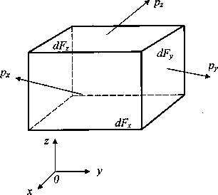 Проведем через точку М три взаимно перпендикулярных плоскости с векторами нормалей, направления которых совпадают с направлениями координатных осей. Элементарные площадки образуем дополнительными сечениями, параллельными исходным плоскостям и отстоящими от них на бесконечно малые расстояния dx, dy, dz. В результате в окрестности точки М получим бесконечно малый параллелепипед, поверхность которого образована элементарными площадками dFх=dydz, dFн==dxdz, dFя=dxdy. Векторы напряжений px, py, pz, действующие на элементарных площадках, показаны на рис. 5.