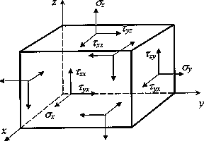 Для компонент тензора напряжений общепринятым является следующее правило знаков: компонента считается положительной, если на площадке с положительной внешней нормалью (т. е. направленной вдоль одной из координатных осей) эта компонента направлена в сторону положительного направления соответствующей оси. На рис. 6 все компоненты тензора напряжений изображены положительными. На площадках с отрицательной внешней нормалью (грани параллелепипеда, не видимые на рис. 5 и 6) положительная компонента направлена в противоположном направлении. Напряжения на трех взаимно ортогональных площадках с отрицательными направлениями нормалей также характеризуют напряженное состояние в точке. Эти напряжения, являющиеся компонентами тензора напряжений, определяются аналогично напряжениям на площадках с положительной нормалью. Они обозначаются теми же символами и имеют положительное направление, обратное изображенному на рис. 6.