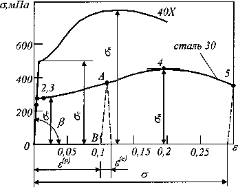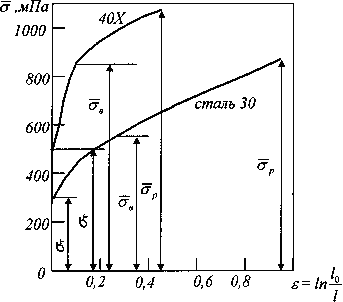 , которая называется диаграммой деформирования. Опыты на растяжение образцов выявляют некоторые общие свойства конструкционных материалов—свойства упругости и пластичности. На рис. 1 показаны типичные кривые деформирования при растяжении образцов из материала сталь 30 и сталь 40Х.
