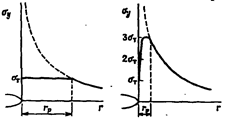 Положим, например, что коэффициент Пуассона n = 1/3. При плоском напряженном состоянии smax = s1 = sТ, а при плоской деформации smax = s1 = csТ »3sТ. Таким образом, в действительности при плоской деформации напряжение оказывается в три раза выше. Перед вершиной трещины в ее плоскости при q = 0 распределение напряжений будет иметь вид, приведенный на рис. 45. Следовательно, при плоском напряженном состоянии напряжения в пластической зоне равны sТ, а при плоской деформации напряжения равны sТ непосредственно в вершине трещины, после чего происходит резкое повышение напряжения до эффективного напряжения текучести 3sТ.