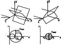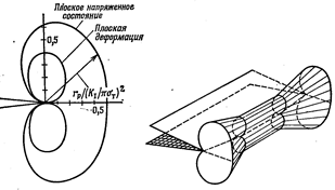 Для плоской деформации нельзя просто воспользоваться приведенными выше зависимостями. Прежде чем приступить к рассмотрению такого состояния, следует проанализировать различие, существующее в конфигурациях пластических зон при плоском напряженном состоянии и плоской деформации. Для этого следует использовать условие текучести Мизеса, представленное через главные напряжения