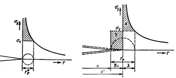 Если в этих зависимостях положить r = rp(q), то можно получить расстояние от вершины трещины до границы, отделяющей упругую область от пластической. Таким образом,