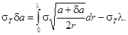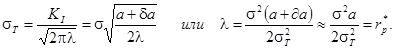 На рис. 43 показано, что действительная трещина имеет длину а. Перед этой трещиной образуется пластическая зона размером rp. Распределение напряжений вокруг пластической зоны приближенно можно представить таким же распределением напряжений, которое получается при замене длины трещины а на а*=а+dа (dа << а). Если считать, что имеет место равновесие нагрузок, то следует положить, что заштрихованная на этом рисунке область А равна заштрихованной области В. Тогда с использованием асимптотических выражений можно установить, что