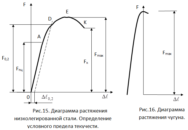 Диаграмма растяжения низколегированной стали изображена на рисунке. Аналогичную диаграмму имеют и другие пластичные материалы, например красная медь, сплавы алюминия.