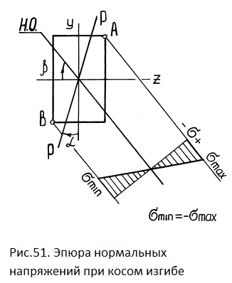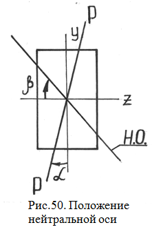 Заметим, что при плоском изгибе нейтральная ось совпадала с одной из главных осей сечения (Oy или Oz), при косом же изгибе это не так. Выведем формулу для определения положения нейтральной оси при косом изгибе.