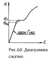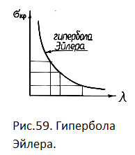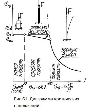 (для стали). Эти короткие стержни будут выходить из строя главным образом за счет потери прочности, потеря устойчивости в таких случаях, как правило, не наблюдается. Таким образом, для стержней малой гибкости при сжатии проводят обычный расчет на прочность, принимая в качестве предельного напряжения предел текучести σт (для пластичных материалов) или предел прочности σв (для хрупких материалов). Этому условию соответствует горизонтальная прямая на рис.61.