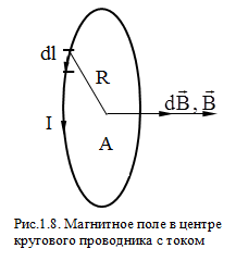 Магнитное поле в центре кругового проводника с током. Рассмотрим круговой проводник с током, изображенный на рис.1.8. Все элементы данного проводника dℓ создают в его центре (точке А) магнитные поля