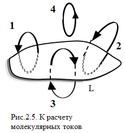 где Iмакро и Iмикро – это алгебраические суммы соответствующих токов, охватываемых замкнутым контуром L. В алгебраическую сумму молекулярных токов входят токи, “нанизанные” на контур, как бусы на нитку (рис.2.5). По рисунку это токи 1 и 2. Прочие токи либо не пересекают поверхность совсем (ток 4), либо пересекают ее дважды – сначала в одном направлении, затем в противоположном (ток 3). Результирующий вклад таких токов равен нулю.