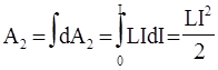 Первое слагаемое dA1 = I2Rdt – это работа, расходуемая на нагревание проводника, т.е. тепло, выделяемое в проводнике за время dt. Второе слагаемое dA2 = LIdI – работа, обусловленная индукционными явлениями. Данная дополнительная работа, затрачиваемая на увеличение силы тока в контуре от 0 до I, находится как интеграл: