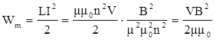 и объем занимаемого полем пространства V. Для этого найдем энергию магнитного поля соленоида. Воспользуемся полученным нами ранее выражением для индуктивности соленоида: