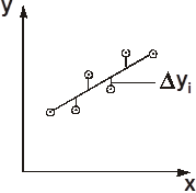Нанесение экспериментальных точек и проведение по ним графика «на глаз», а также определение по графику абсцисс и ординат точек, не отличаются высокой точностью. Её можно повысить, если использовать аналитический метод. Математическое правило построения графика заключается в подборе таких значений параметров «а» и «в» в линейной зависимости вида у = ах + b, чтобы сумма квадратов отклонений Dуi (рис. 5) всех экспериментальных точек от линии графика была наименьшей (метод «наименьших квадратов»), т.е. чтобы величина
