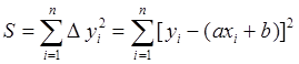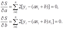 имела минимум. Здесь xi и yi - значения величин х и у в i-том измерении, n - количество измерений. Величина S будет минимальной, если её частные производные по параметрам а и b будут равны нулю: